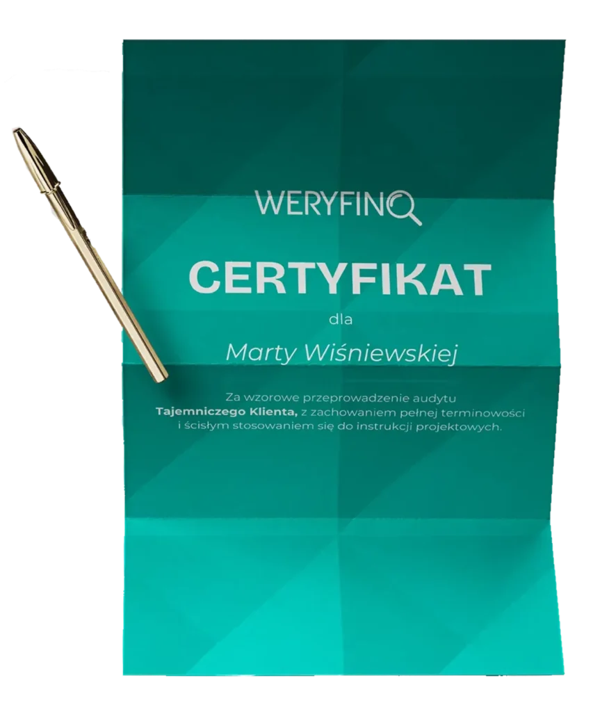 Jeśli chcesz, aby Twoja firma rosła, nie możesz opierać się na domysłach. Wiedza o tym, co czuje klient, wychodząc z Twojego sklepu, jest bezcenna. Audyt WERYFINO daje Ci tę wiedzę na tacy – uporządkowaną, przeanalizowaną i gotową do wdrożenia. To Twoja tajna broń w walce o pozycję lidera rynku.